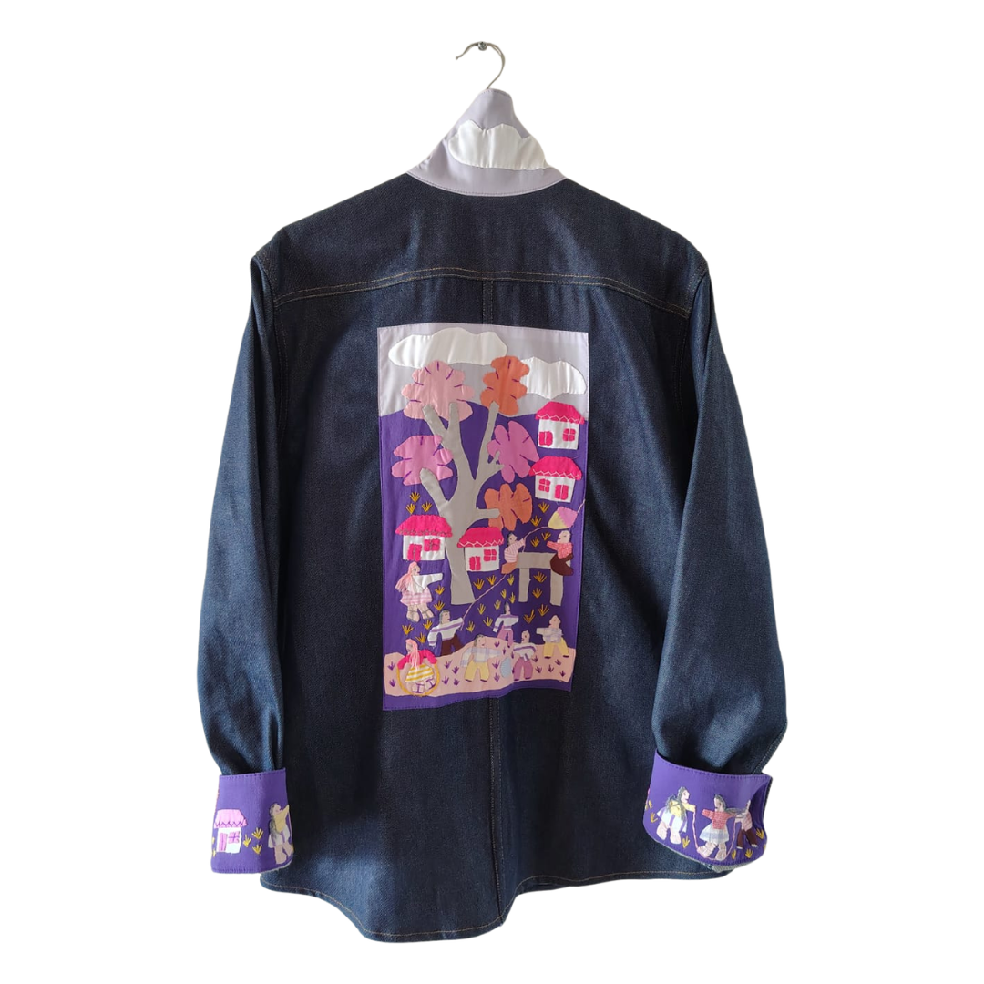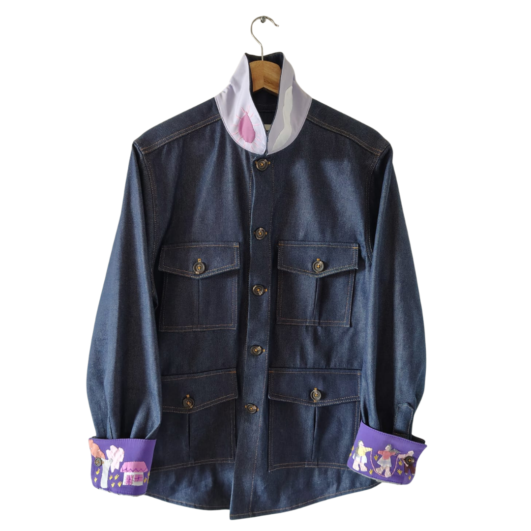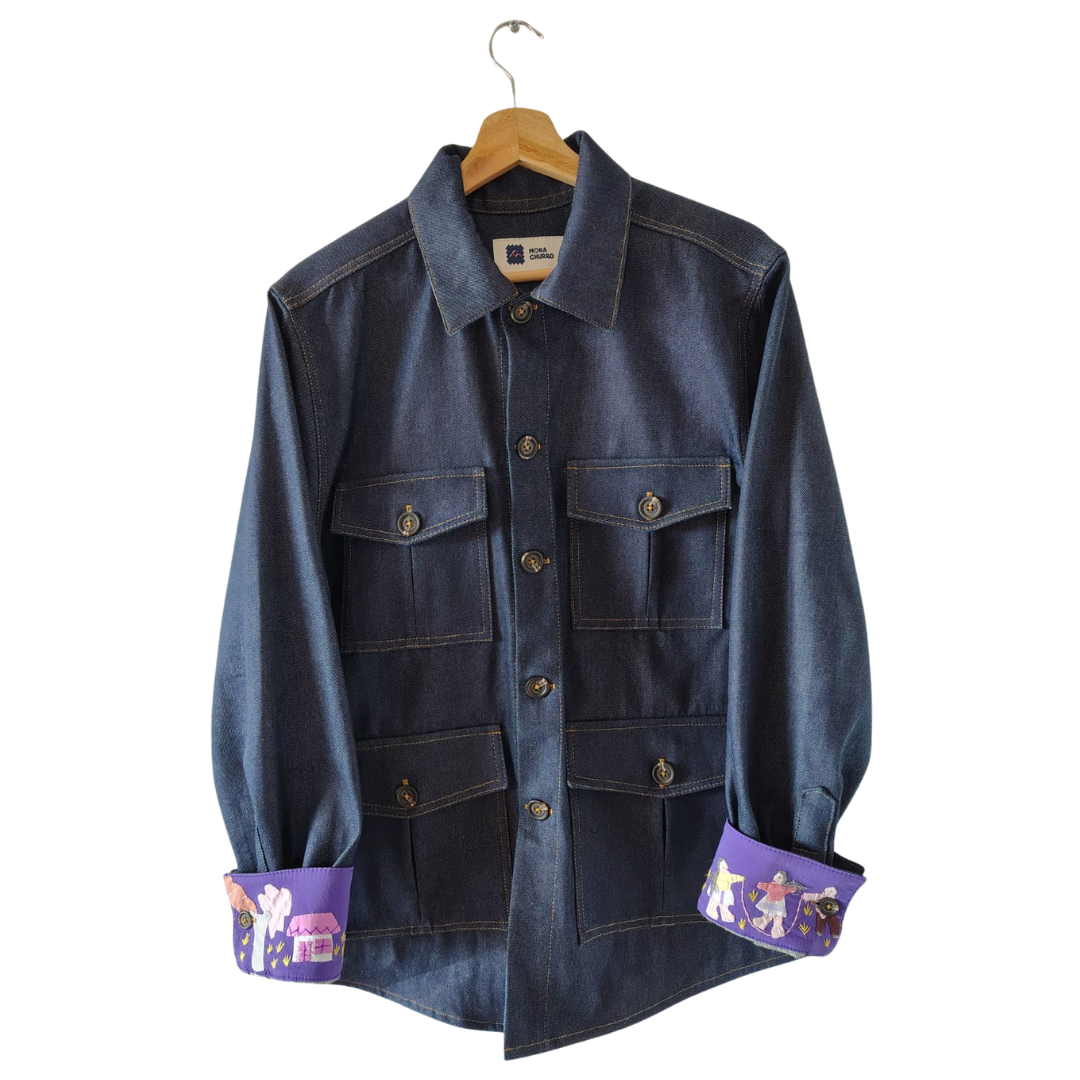 Description:Chaqueta en denim azul  oscuro sostenible. Tiene tejidos* en tonos morados. Pieza única.
