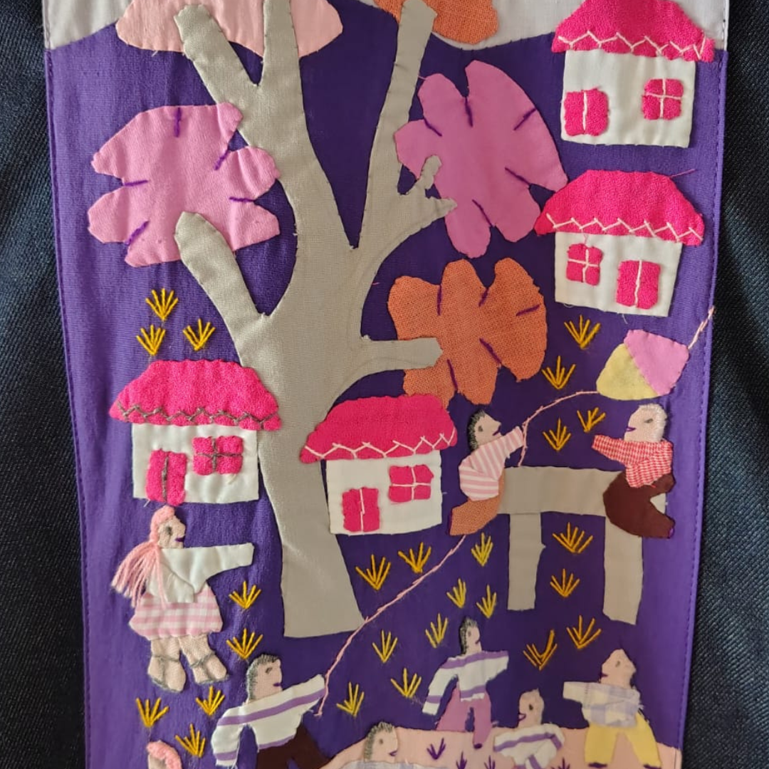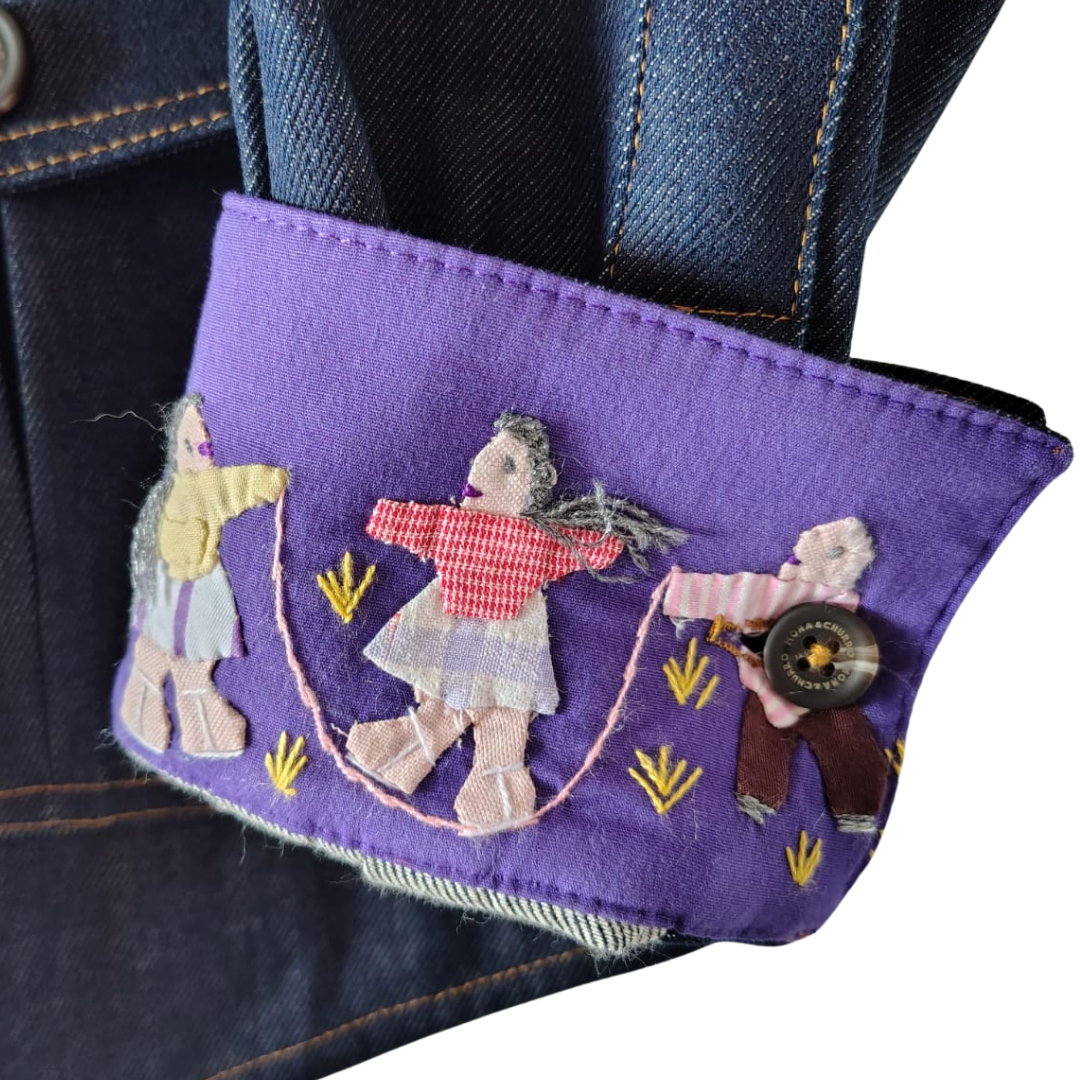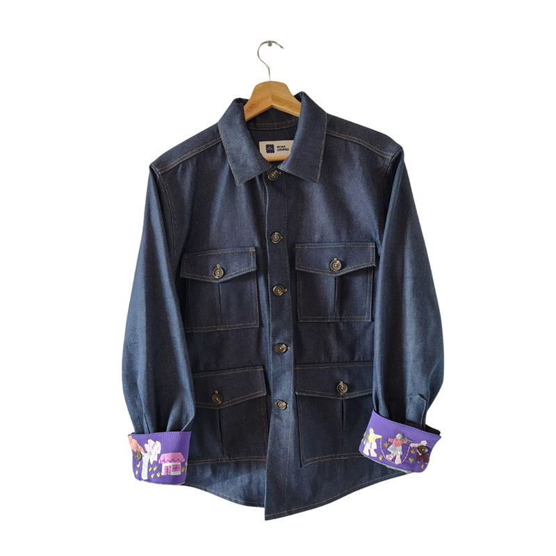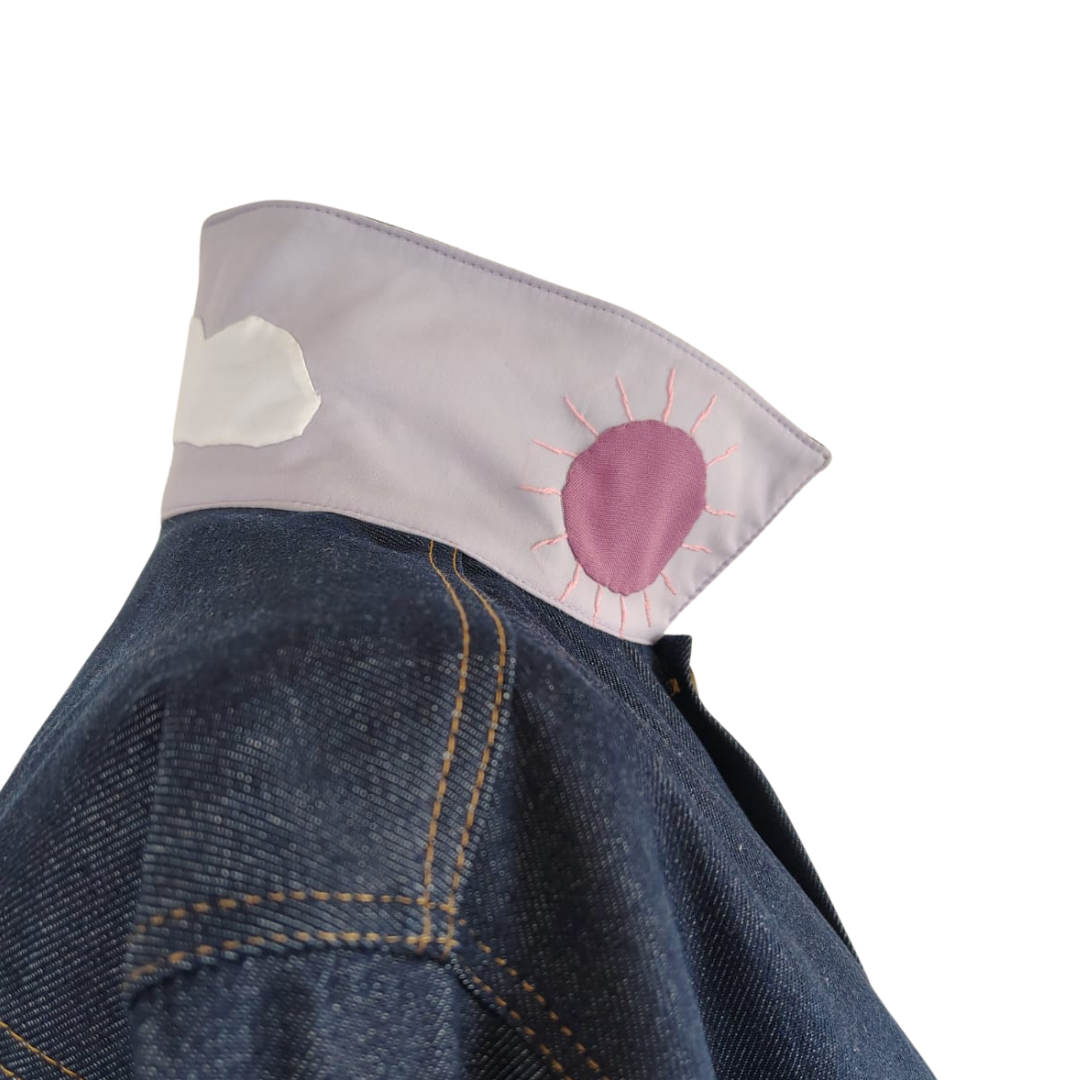Description:Chaqueta en denim azul  oscuro sostenible. Tiene tejidos* en tonos morados. Pieza única.