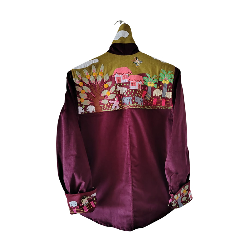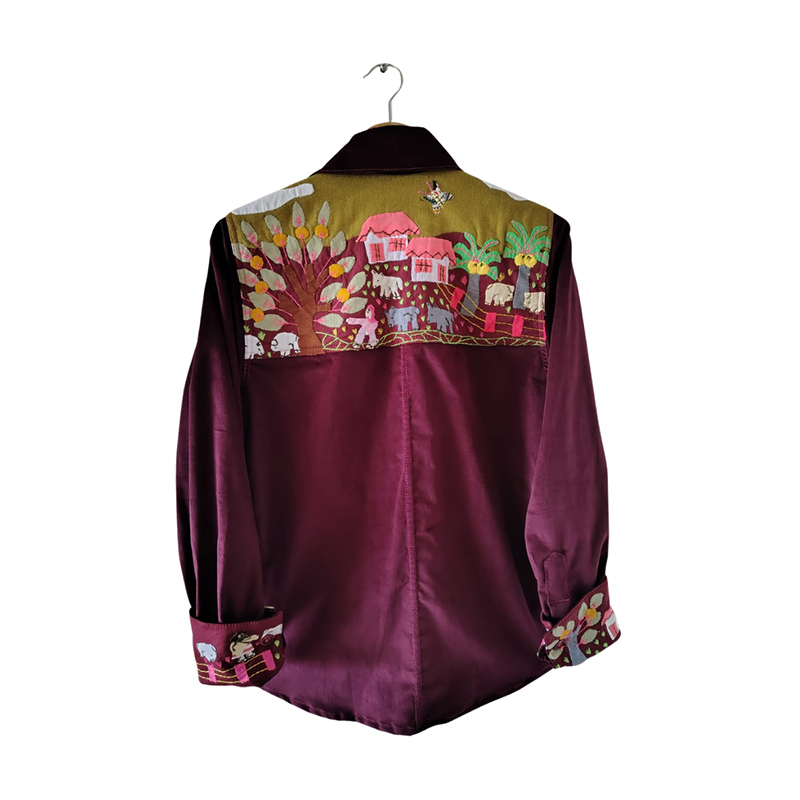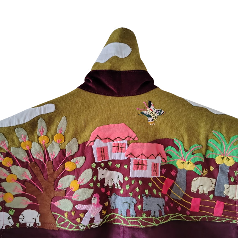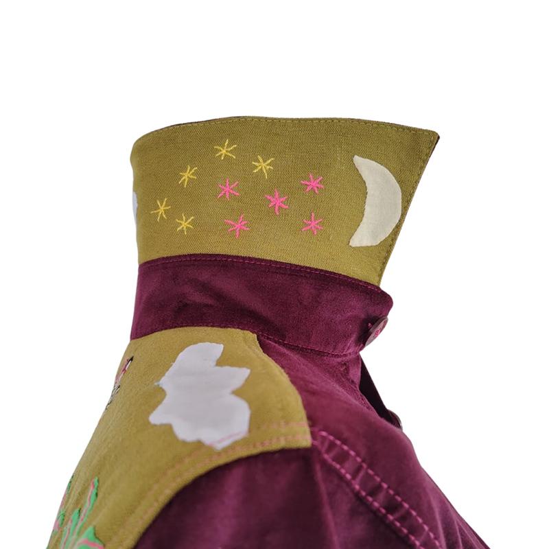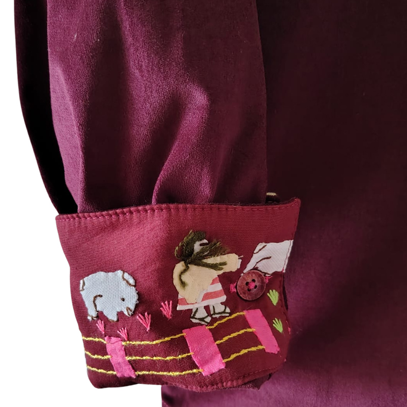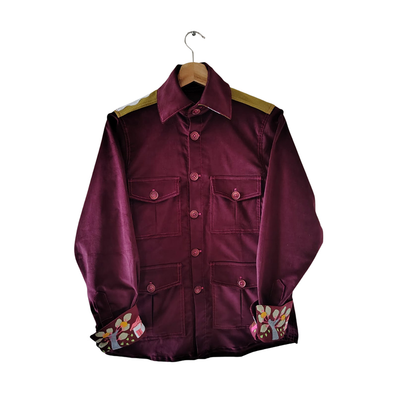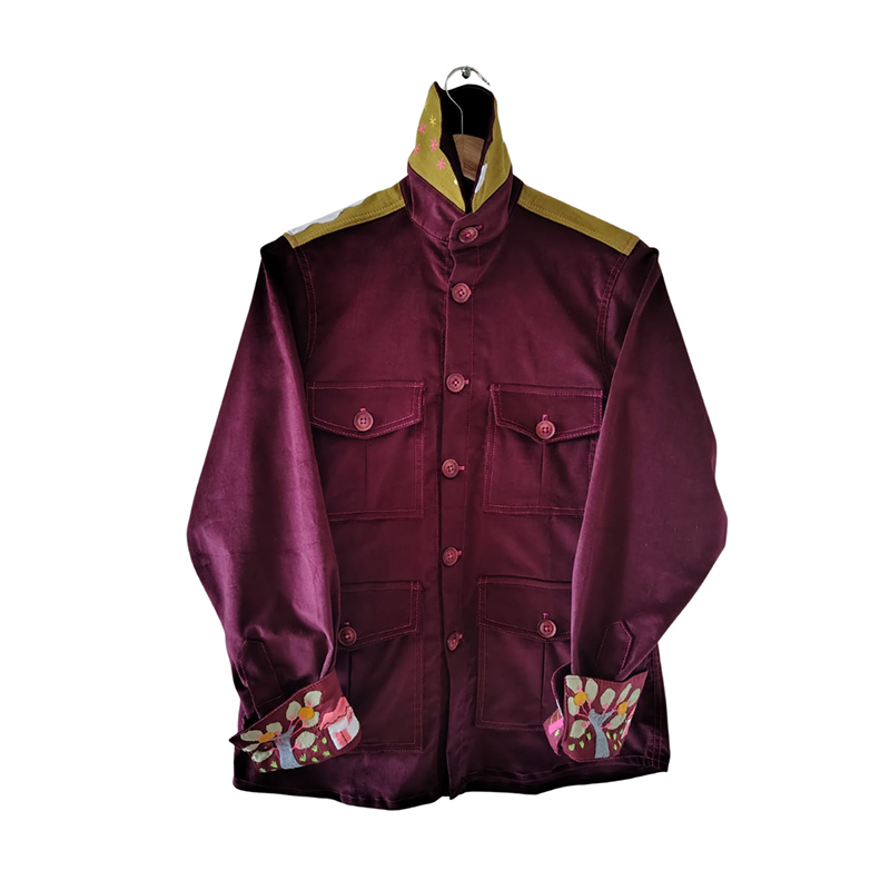 | Description: | Chaqueta en kenna color vinotinto con tejidos* en tonos verdes y vinotintos. Tiene pespuntes visibles color fucsia. Pieza única. made by lovely Colombian women in Bogotá. |