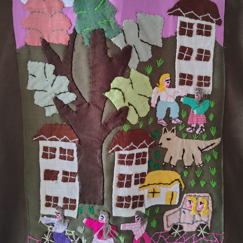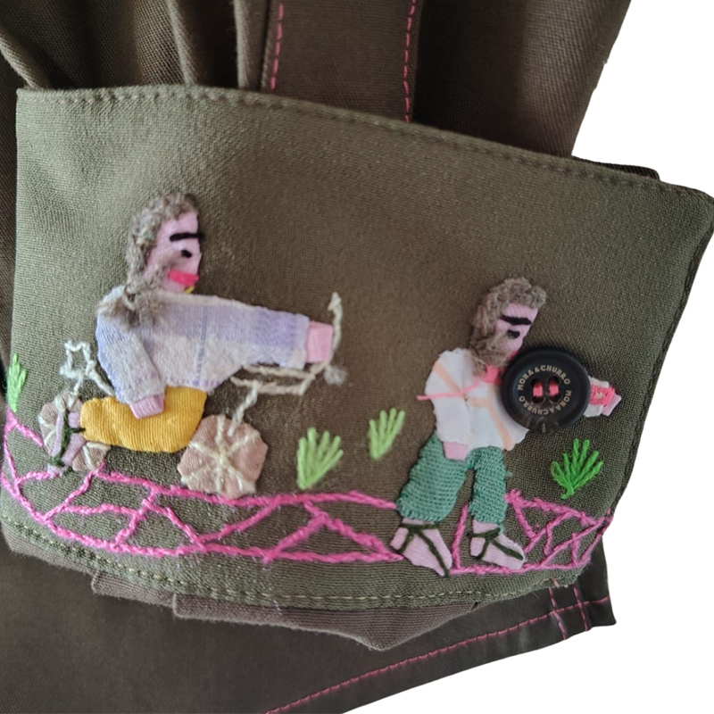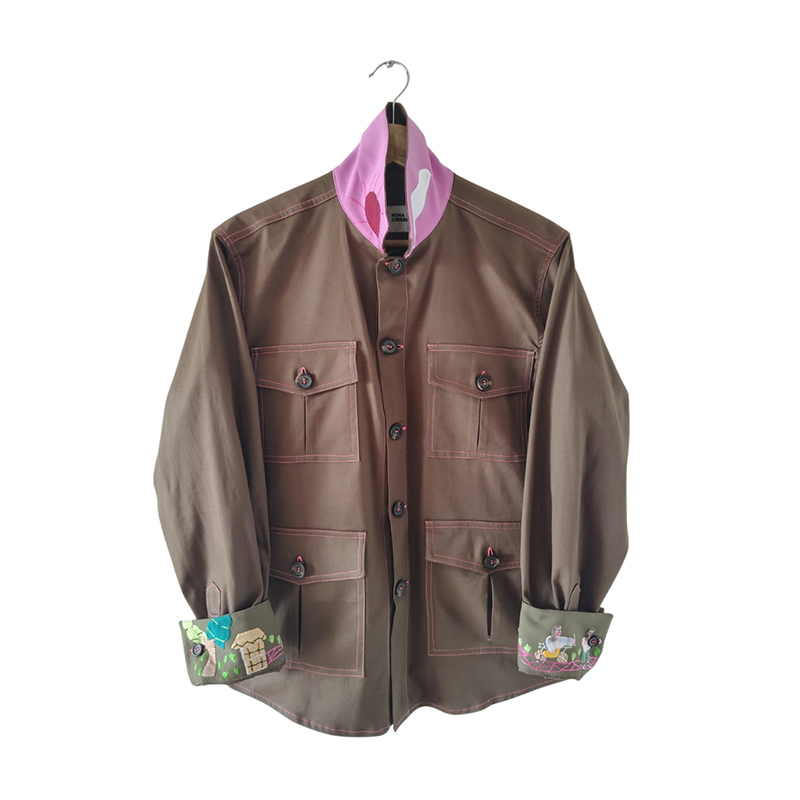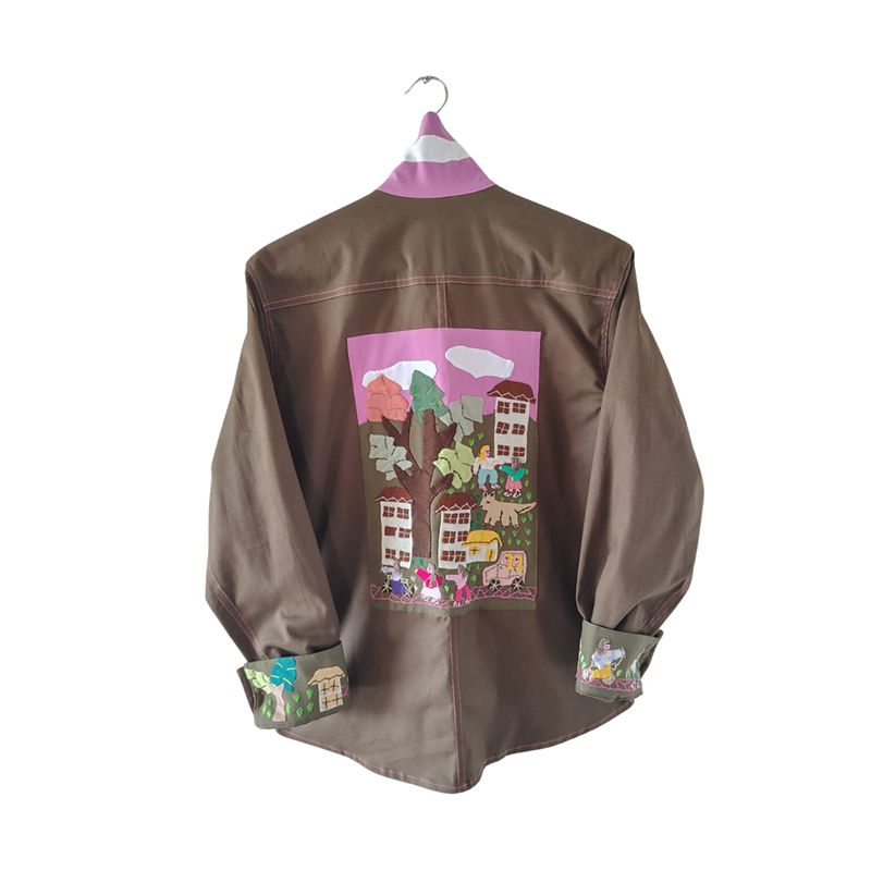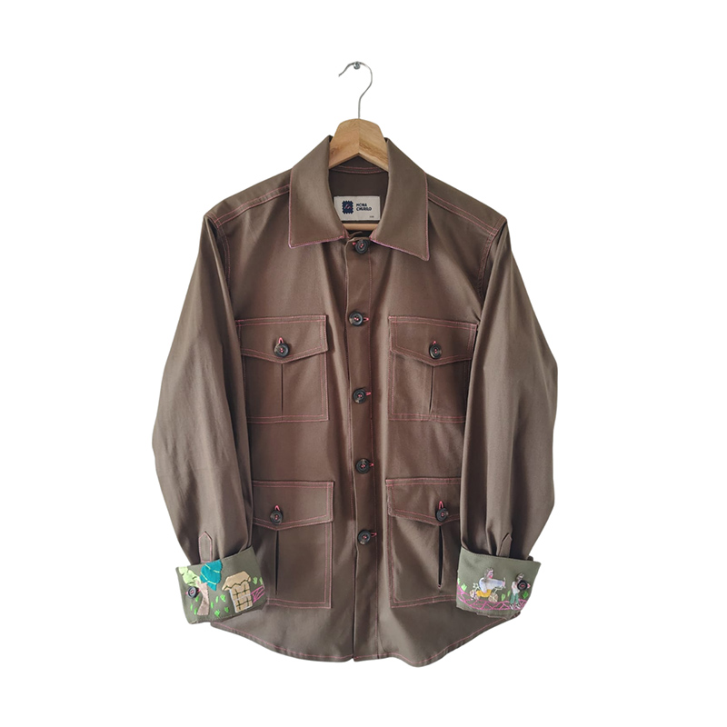 | Descripción: | Chaqueta en dril color café inglés con tejidos* en tonos verdes y lilas. Tiene pespuntes visibles color rosado fosforescente. Pieza única. |