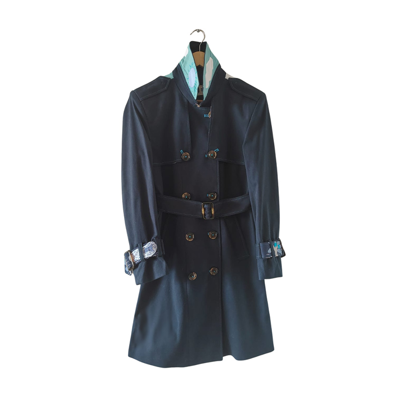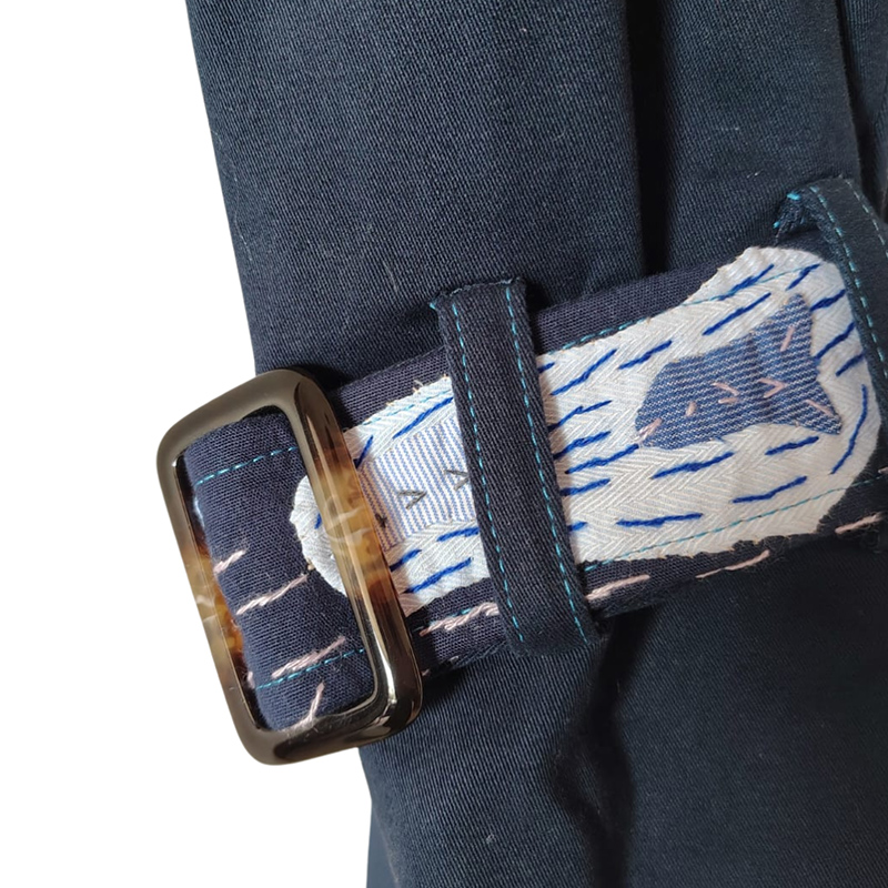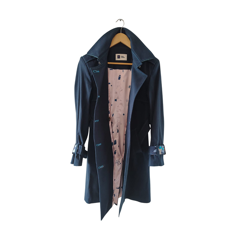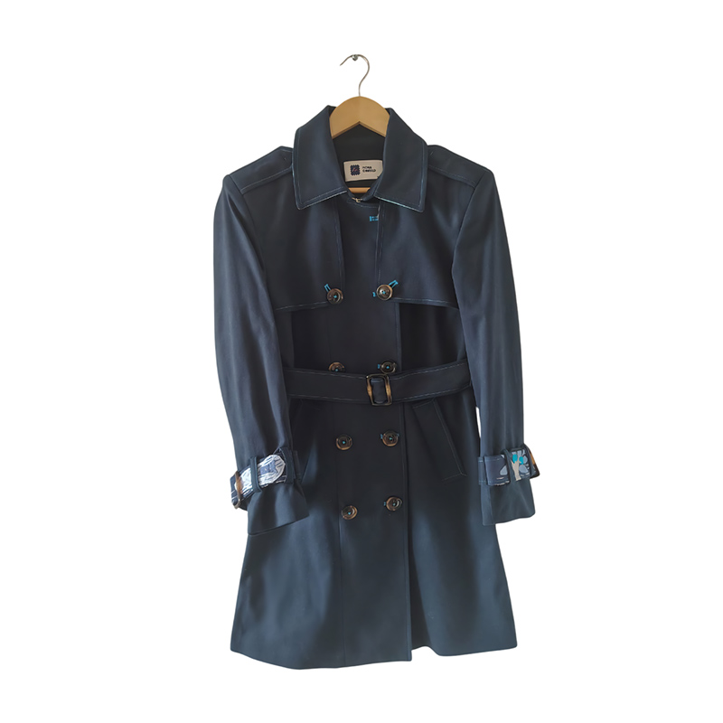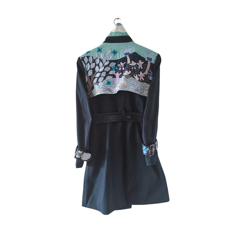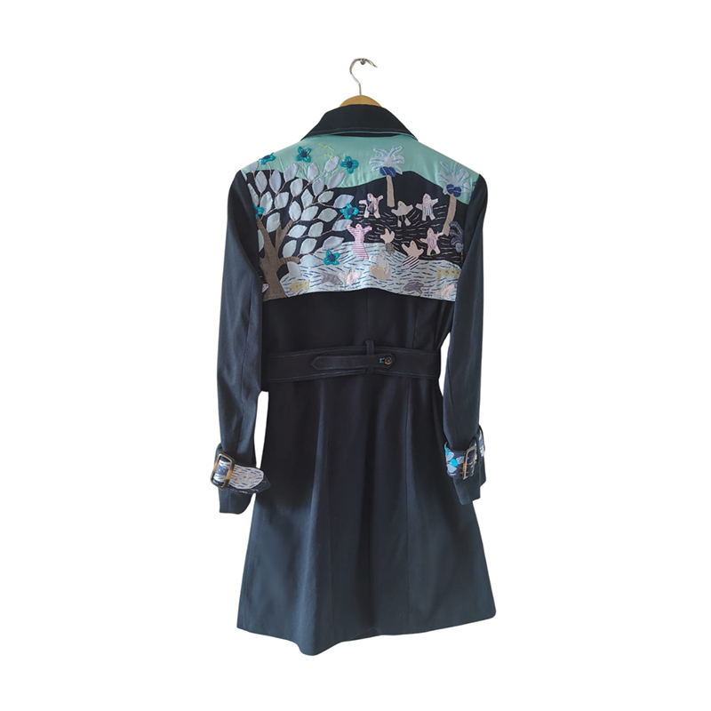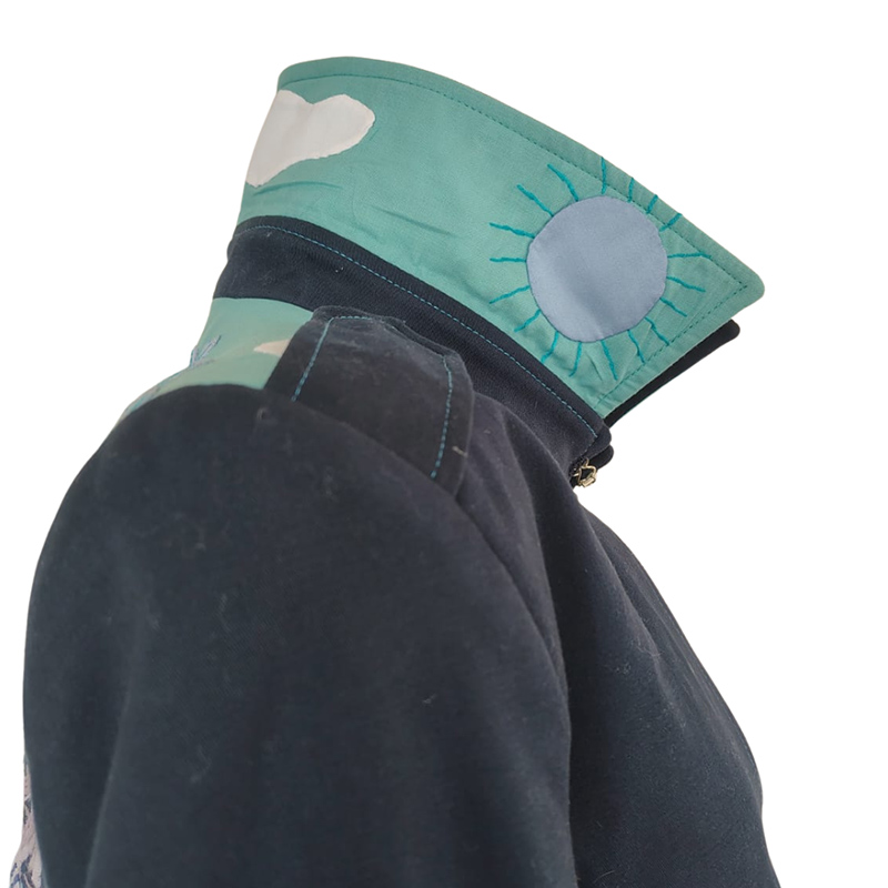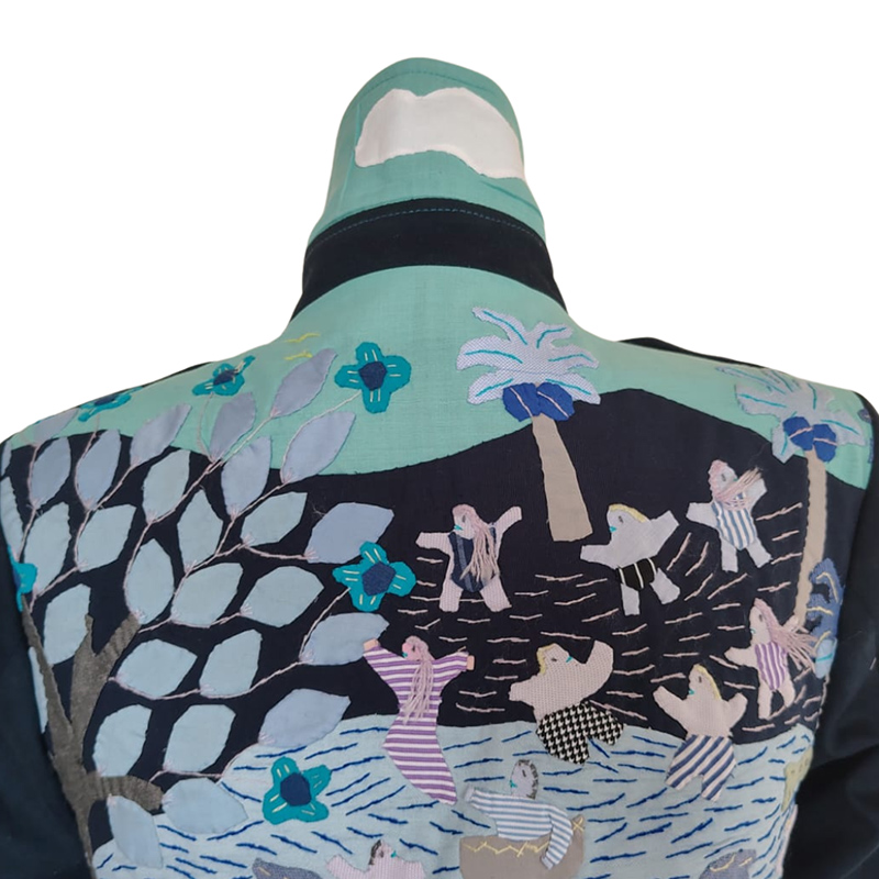 | Descripción: | Gabán de dril color azul oscuro con tejidos* en cuello, espalda y charreteras en tonos azules. Pegues, ojales y pespuntes en color azul neón. Pieza única. |